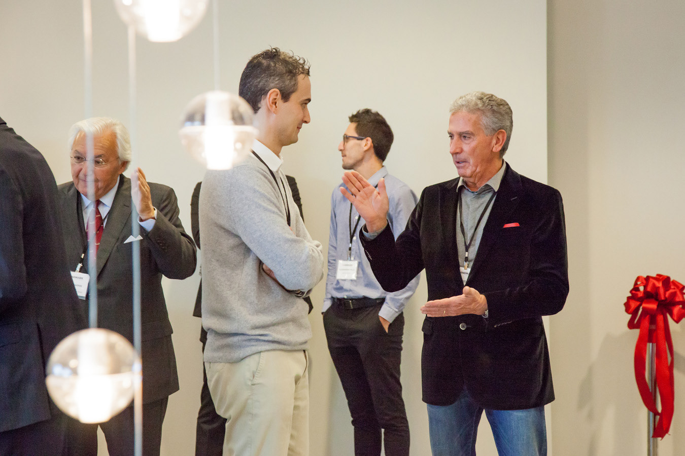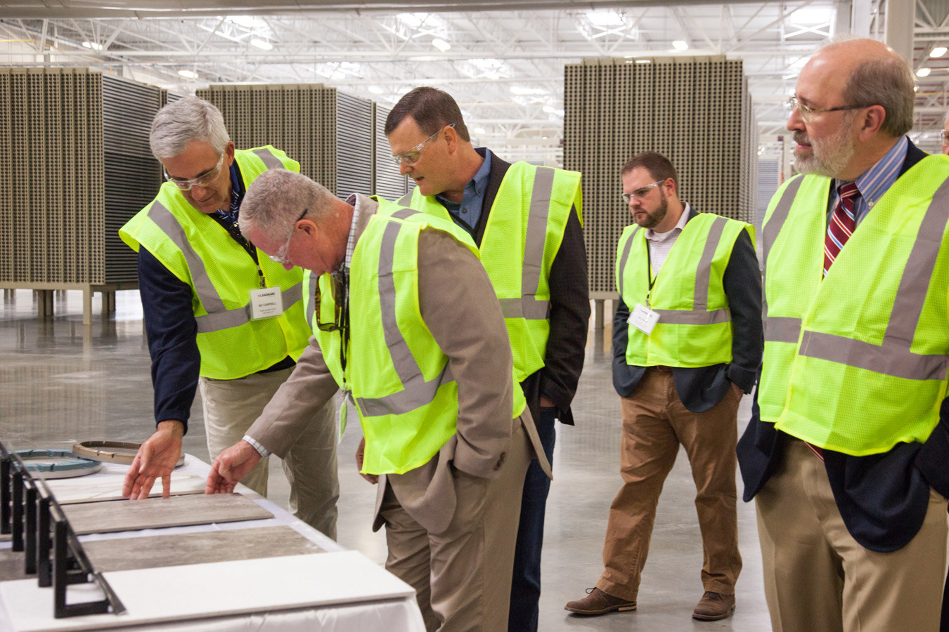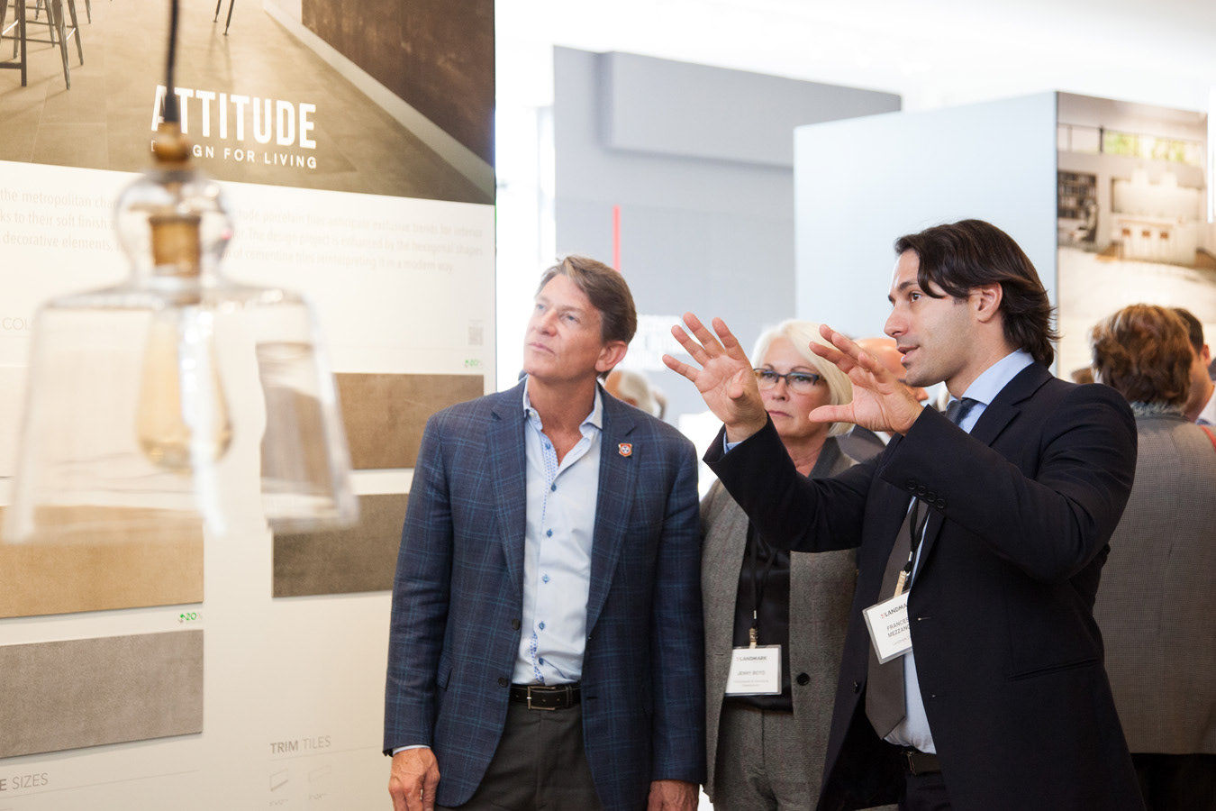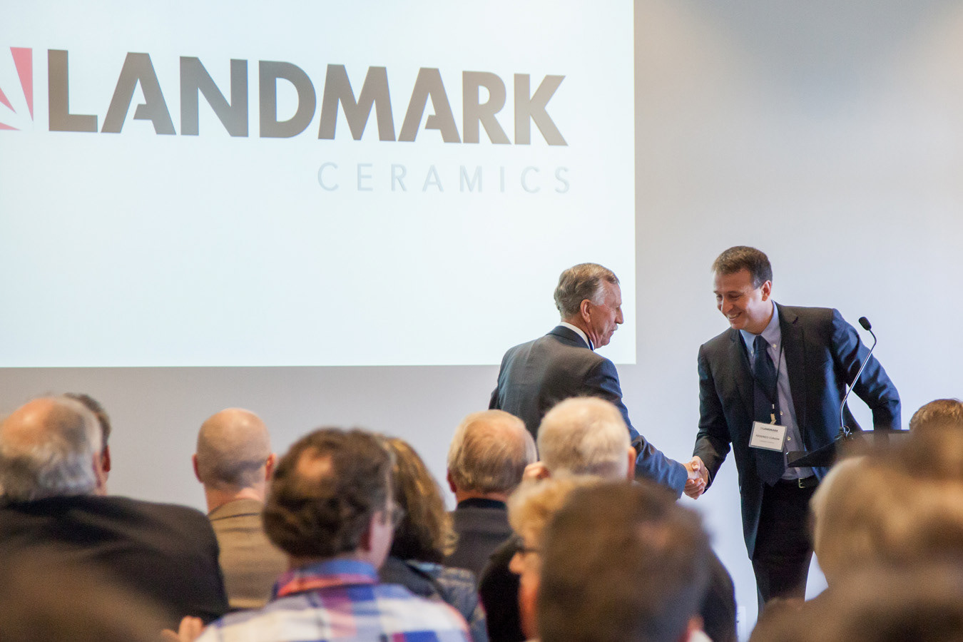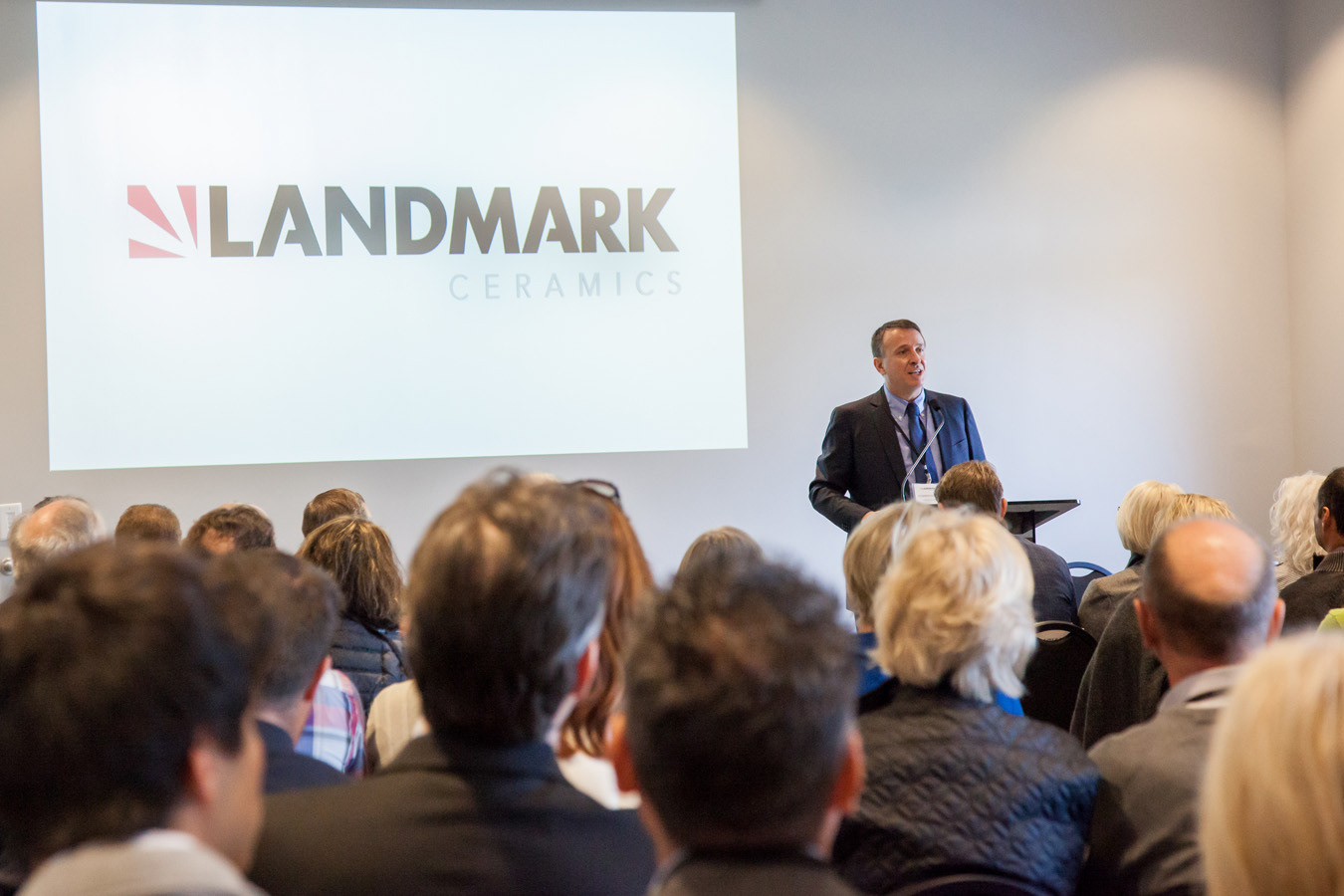 CEO of Landmark Ceramics welcomes guests at the opening reception of a new factory.